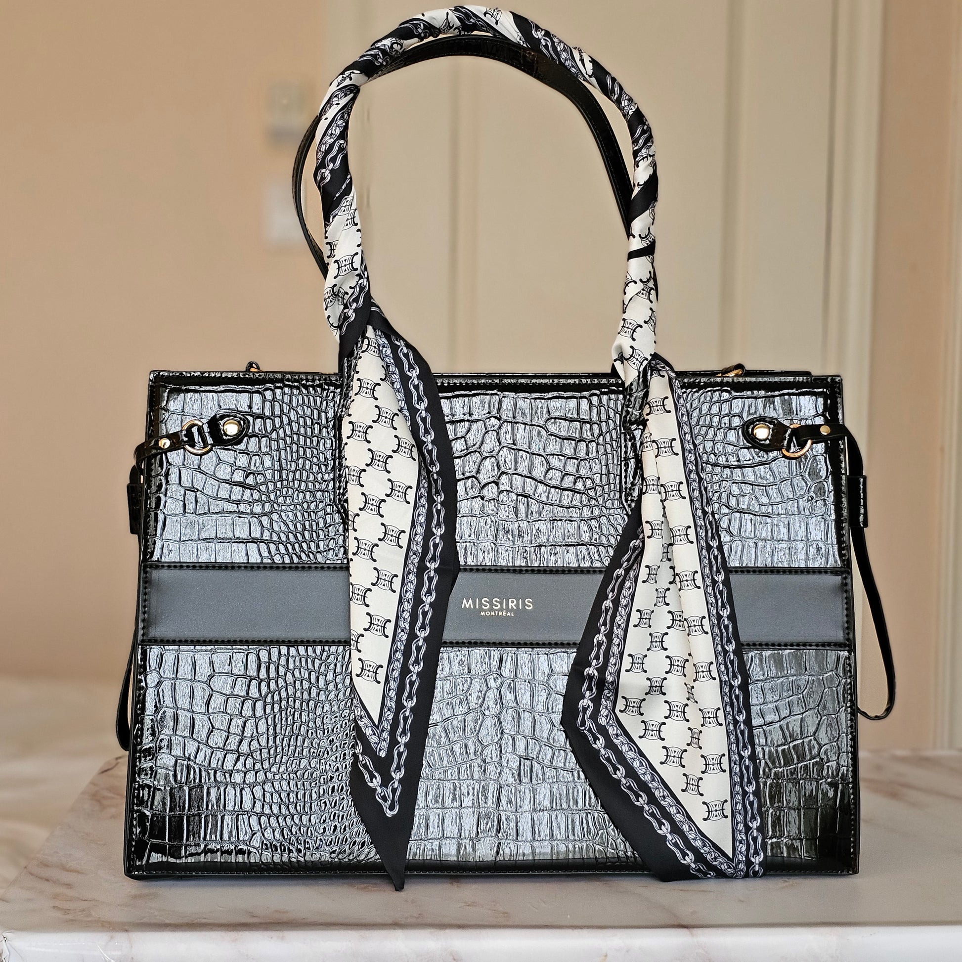 Que tu le noues à la poignée de ton sac, en fasses un joli nœud ou que tu le portes comme un accessoire mode à part entière, ce foulard apporte une dose de luxe à chaque détail. Associe-le à ta pièce Missiris préférée — ou laisse-le briller tout seul.