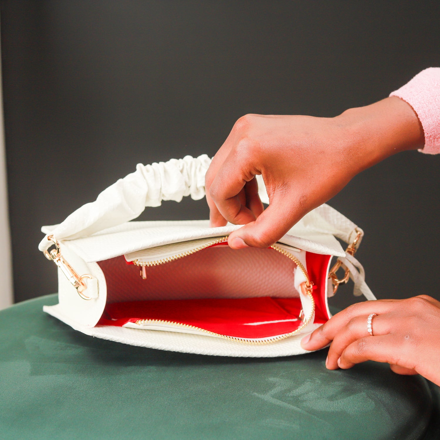 At MissIris, no detail is too small. Before finding the perfect material, we tested a dozen vegan leathers, evaluating their resistance, texture, and durability over time. Our objective was clear: to offer a material that was long lasting, but also refined and easy to use.We chose a premium vegan leather, known for: its exceptional resistance, maintaining its shape and shine despite daily use; its refined texture, soft to the touch, reminiscent of the finest traditional leathers; its meticulous finish, elegant and durable, giving each bag a luxurious and timeless look. Linings, stitching, and metallic hardware were also carefully selected to guarantee flawless quality down to the smallest details. This research and development process illustrates our commitment: creating handbags designed to last, to accompany women over time, and to embody our vision of responsible luxury.
